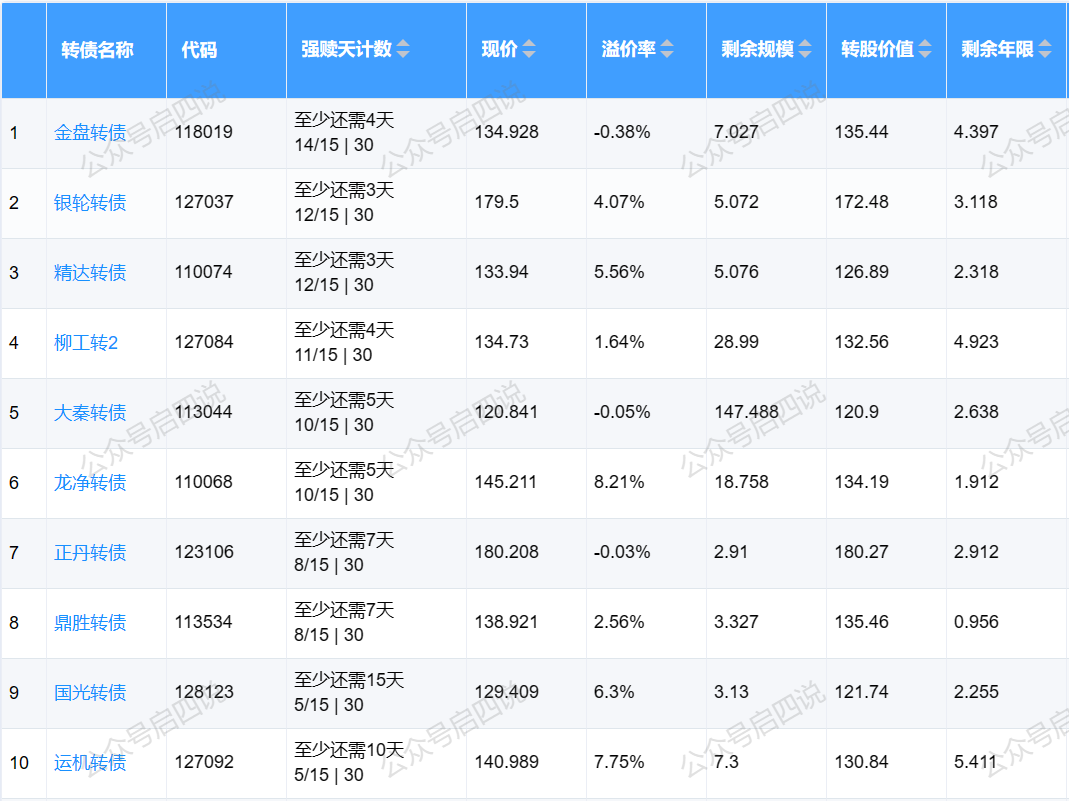 下面这些转债,要注意强赎杀溢价风险,尤其是溢价率在5%以上的。