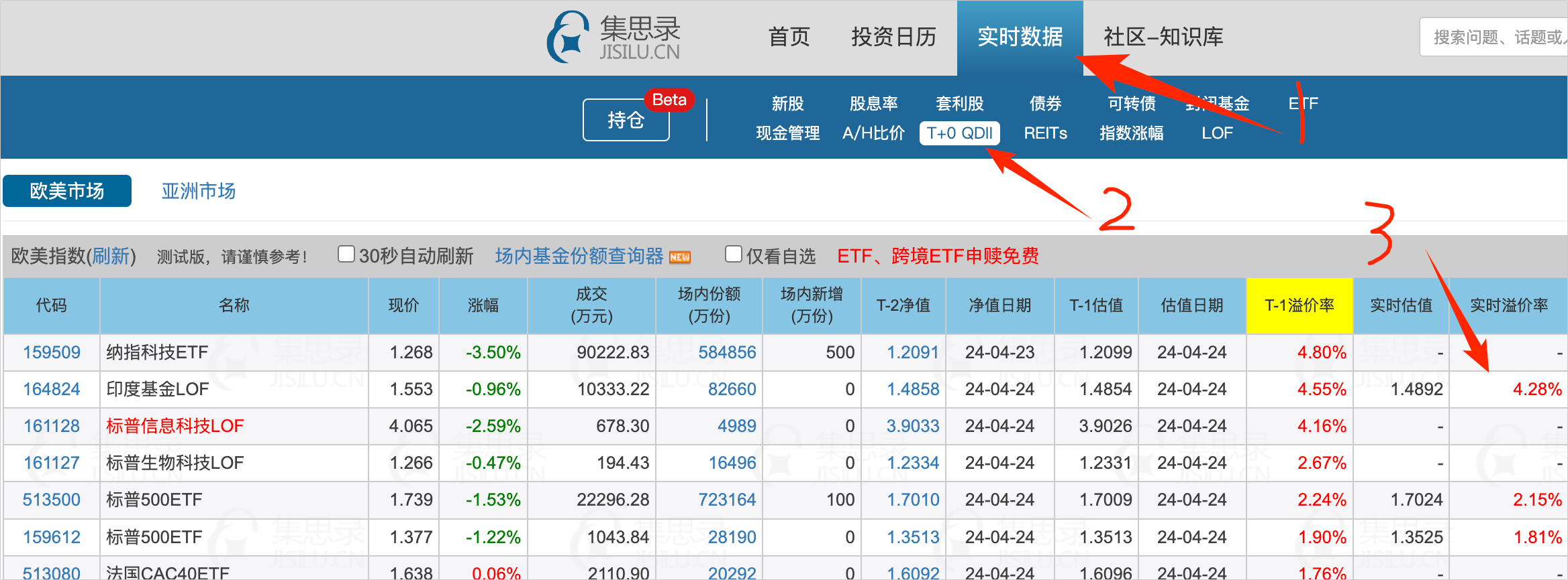 实时数据——T+0QDII——找到基金——查看实时溢价率