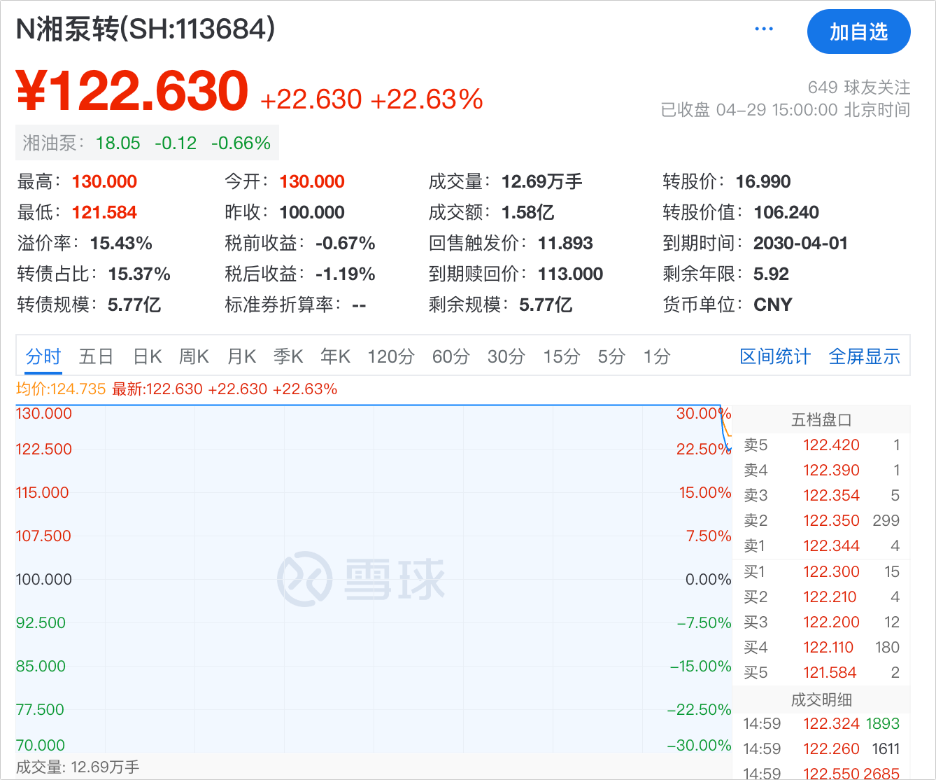 今天上市的湘泵转债,开盘130元涨停,符合昨天预估合理价。