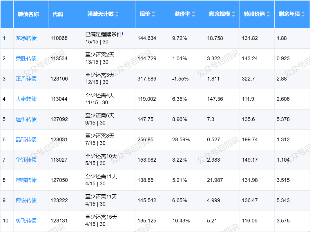 下面这些转债,要注意强赎杀溢价风险,尤其是溢价率在5%以上的。