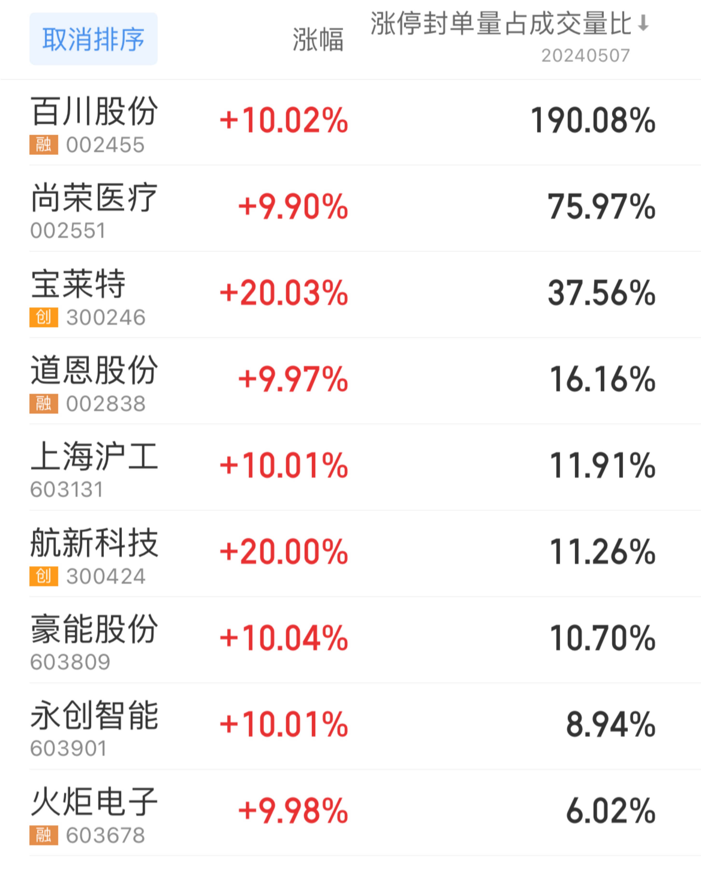 从涨停封成比来看,百川股份、尚荣医疗次日继续高开的概率大一些,其余正股不一定能高开。