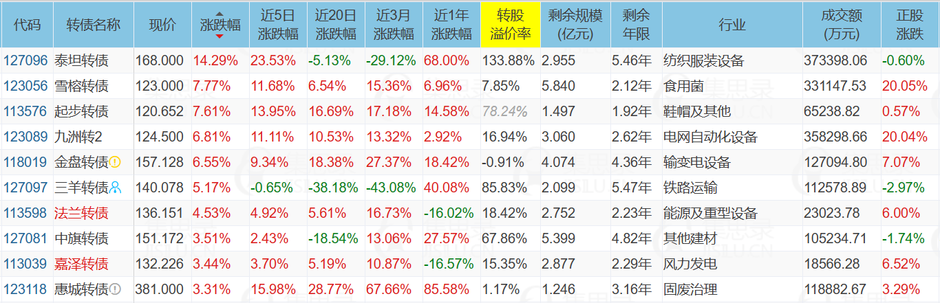 1、今天的涨幅榜中泰坦转债、三羊转债、中旗转债,这三只之前的妖债又开始活跃了起来。有些不明所以的小白最喜欢追高这类转债,它们恰恰是最容易套人的,往往上涨六七天,一天就让你连本带利吐出来,要做的话前提一定是日内短线,且需要高度集中精力盯盘。