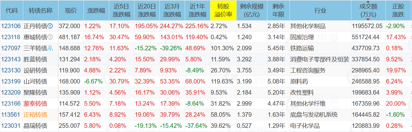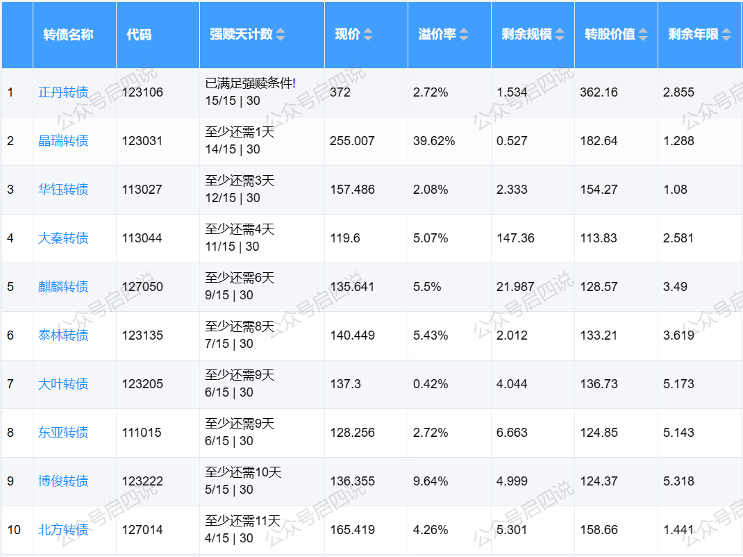 1、正丹转债,公告强赎,当前价格372元,溢价率2.72%。