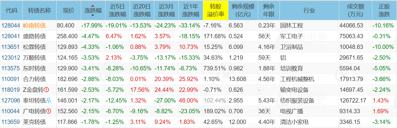 跌幅榜第一的岭南转债,收到了问询函,今天正股跌停,转债狂跌17.99%,当前溢价率-7.16%,跌停封成比接近100%,明天大概率延续跌势。