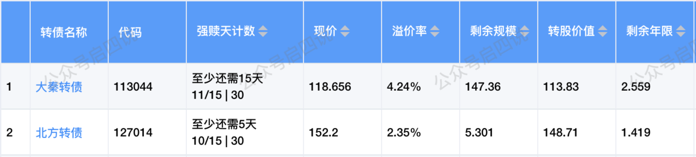 下周只有北方转债可能满足强赎条件,剩余年限只有1.419年,强赎的概率较大。