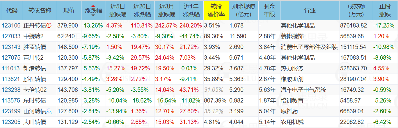 3、跌幅榜第一的正丹转债,正股今天短暂冲高后一路下跌。
