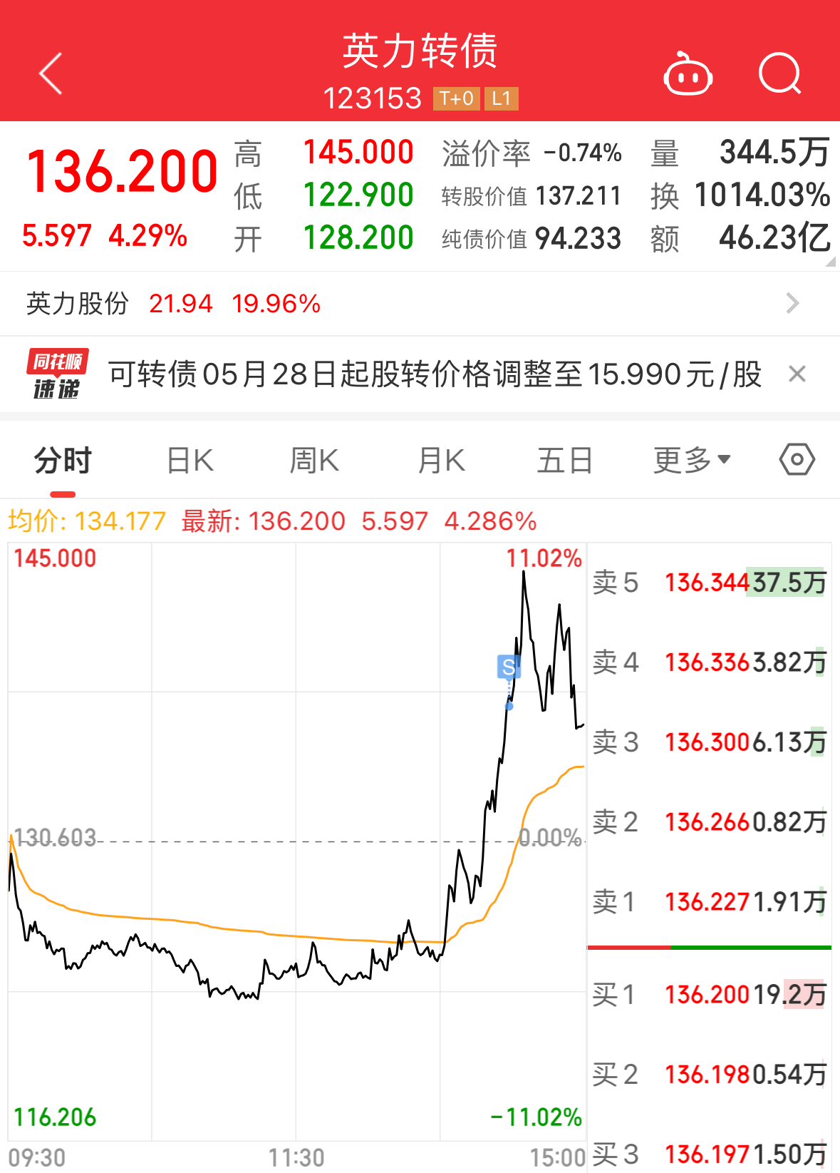 英力转债,今天绝地大翻盘,盘中最大跌幅近6%,午后突然急速拉升,最高涨幅达11%,太刺激了。