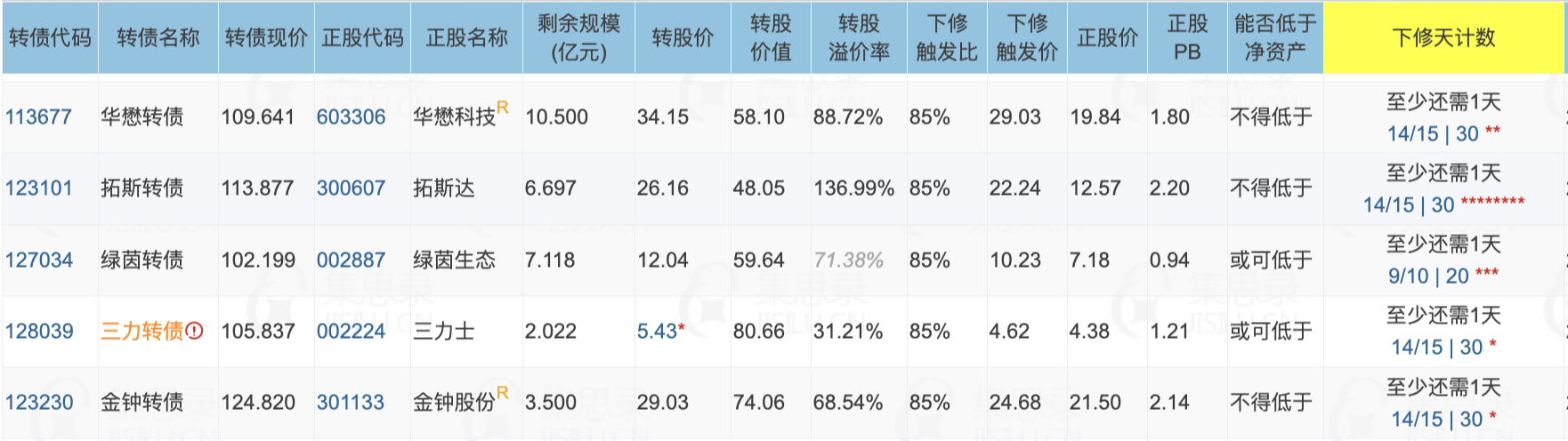 3、明天最快有5只转债满足下修条件,其中金钟转债、绿茵转债、拓斯转债下修动机较强。