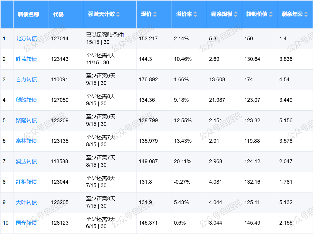 下面这些转债,要注意强赎杀溢价风险,尤其是溢价率在5%以上的。