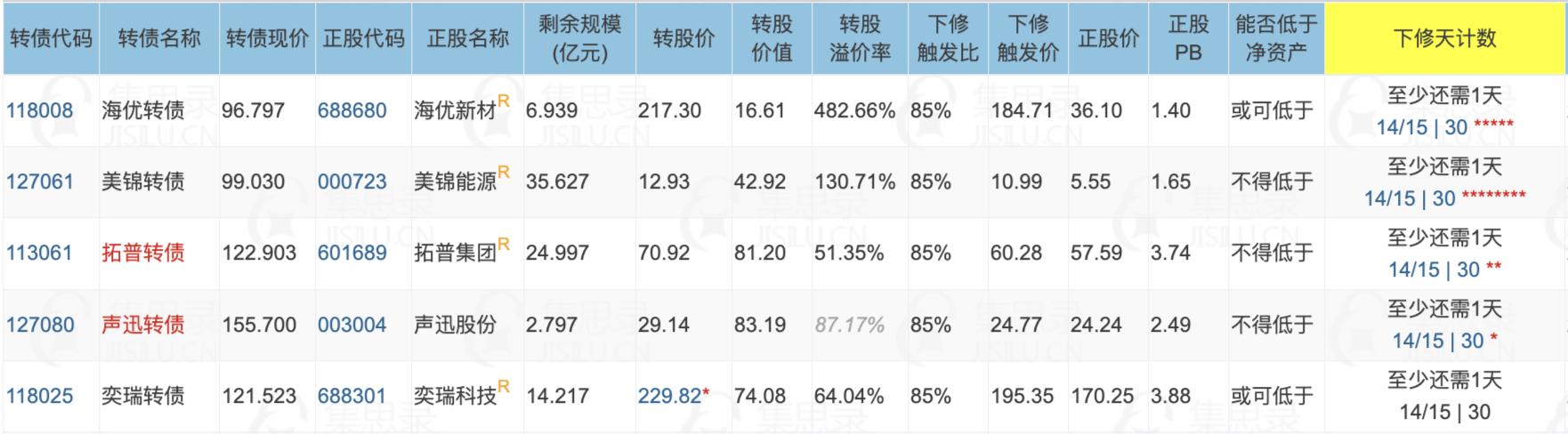 3、明天最快有5只转债将满足下修条件,个人认为下修动机都不强。