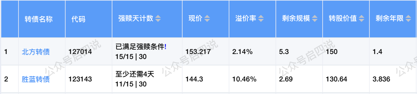下周只有北方转债可能满足强赎条件,剩余年限只有1.419年,强赎的概率较大。