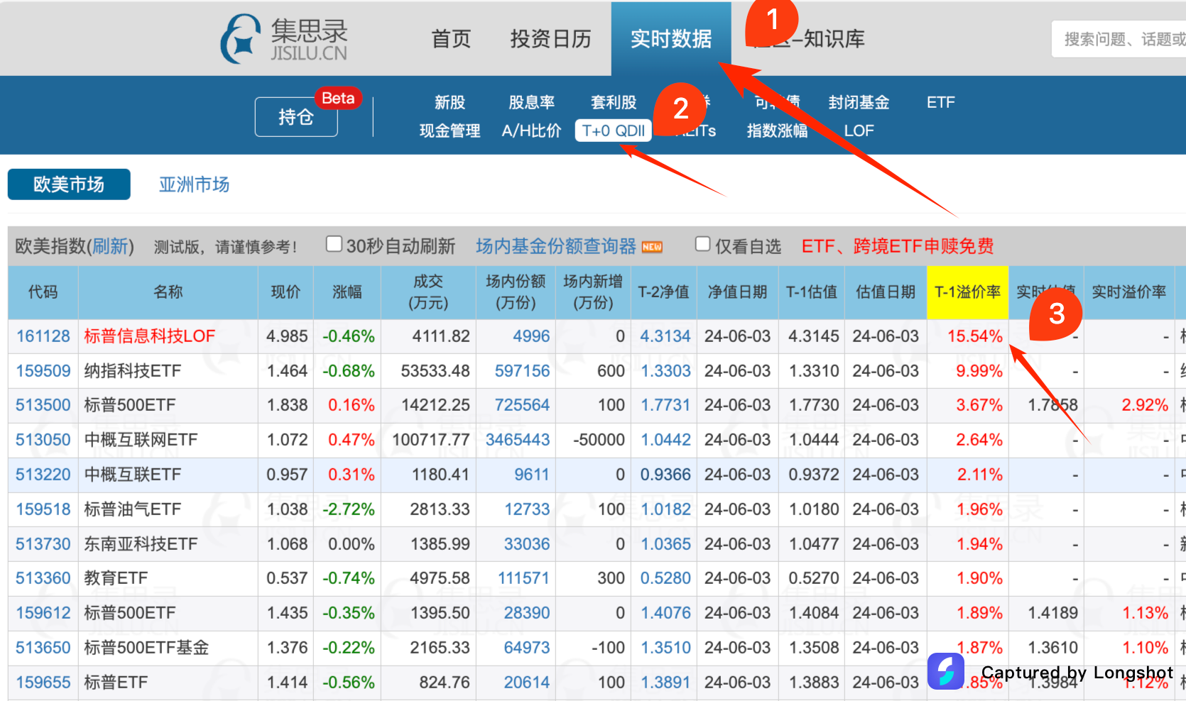 实时数据——T+0QDII——找到基金——查看实时溢价率