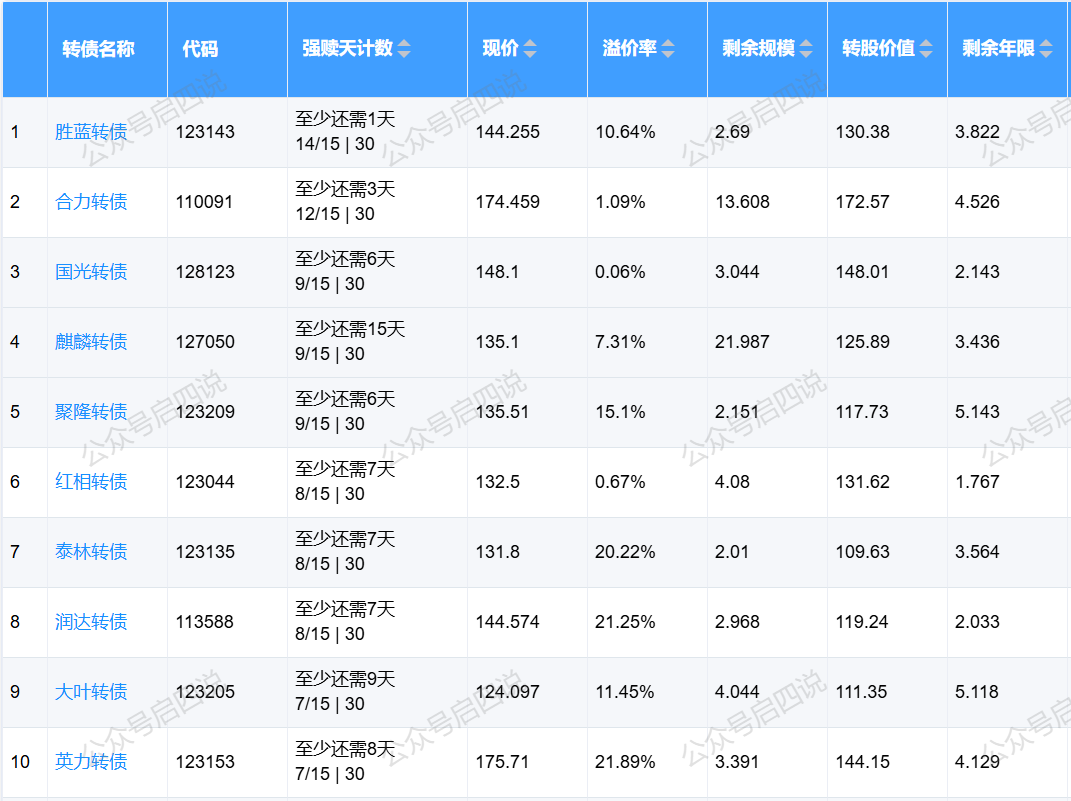 明天胜蓝转债将满足强赎条件,现在溢价率还高达10%+,一旦强赎,转债溢价直接会被杀到0%附近,风险很大。