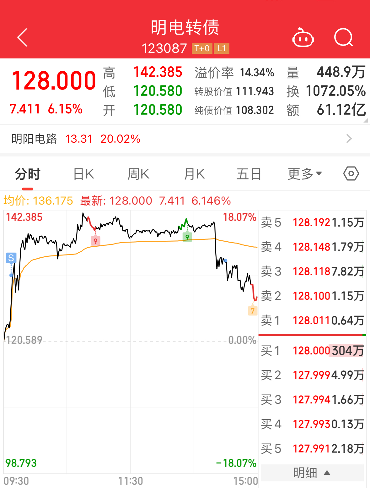 明电转债今天大涨的原因是PCB板(印刷电路板)概念大涨,因为AI有望带动HDI技术用量大幅增长,公司明阳电路主营PCB产品,800G光模块目前具备样品和小批量能力。