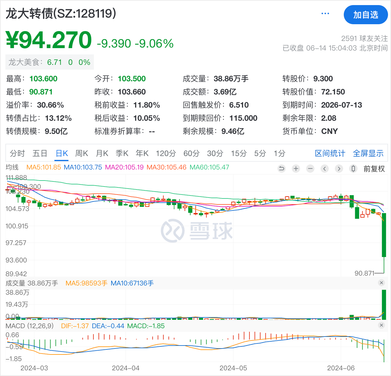 2、龙大转债,正股横盘,转债大跌9.06%,转债价格从103.66暴跌到94.27,全天都在均线以下。