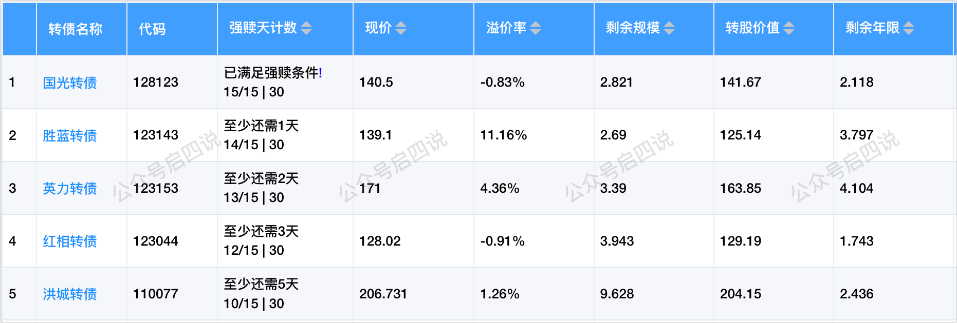 国光转债,公告强赎,现价140.5,溢价率-0.83%,剩余规模2.821亿。