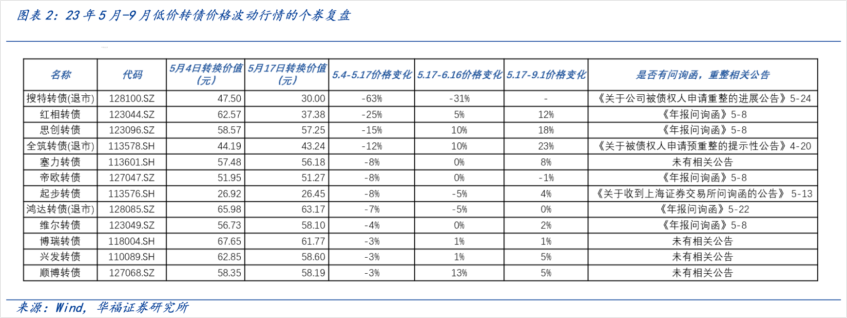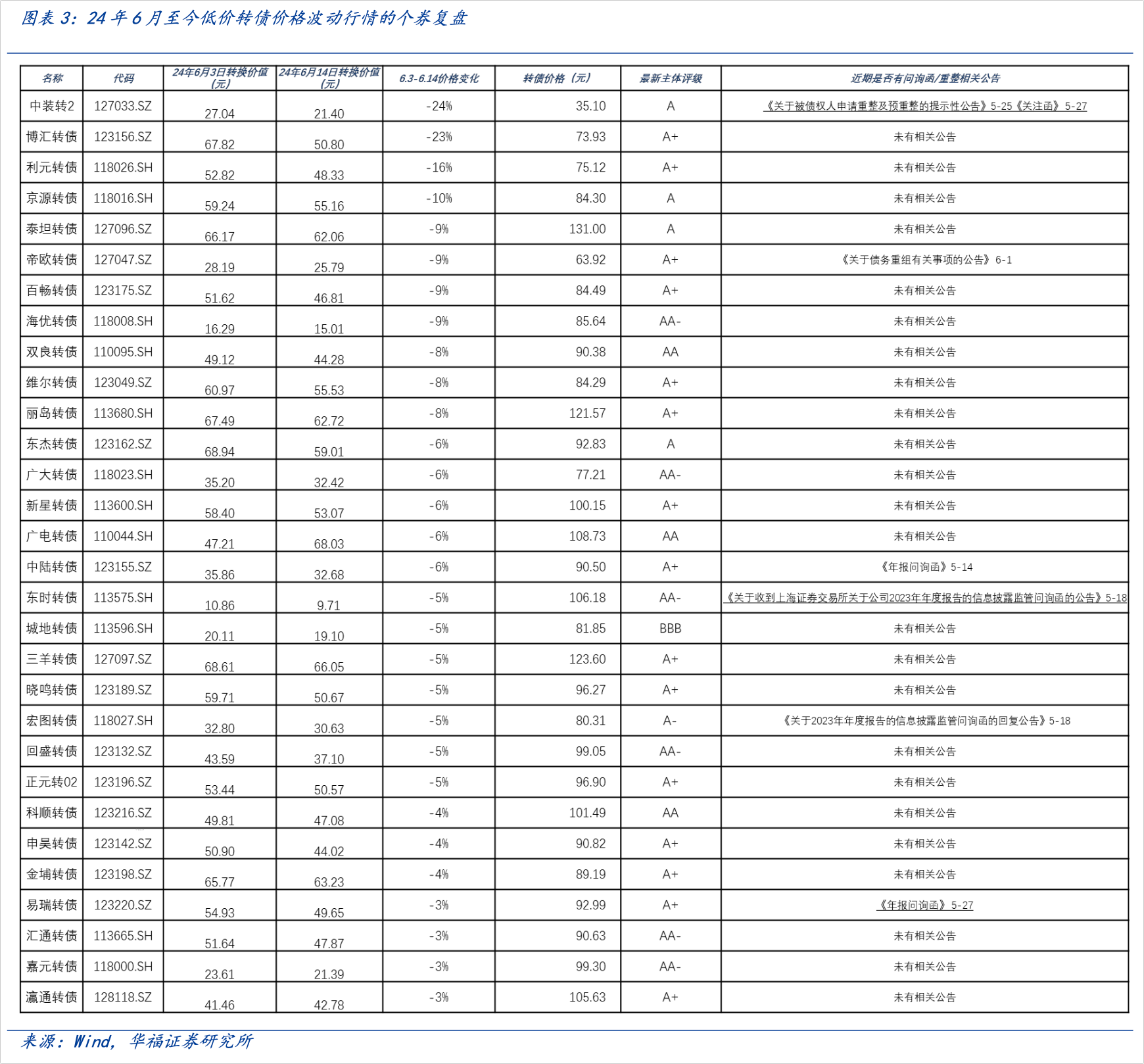 这轮行情中,6月3日-6月14日期间累计跌幅超过3%的转债有30支,只有少数几支发布了重整或问询函公告,其他的并没有。因此,华福证券认为部分标的价格波动是因为外部风险。