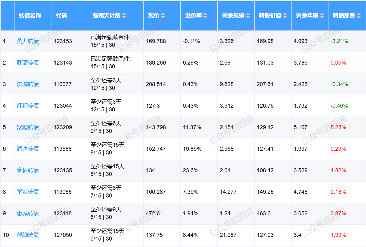 下面这些转债,要注意强赎杀溢价风险,尤其是溢价率在5%以上的。