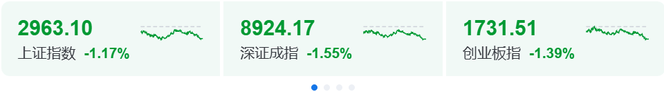 市场全天低开低走,三大指数均跌超1%。指数黄白分时线明显分化,中小盘股普跌。沪深两市今日成交额6956亿,较上个交易日放量760亿。截至收盘,沪指跌1.17%,深成指跌1.55%,创业板指跌1.39%。