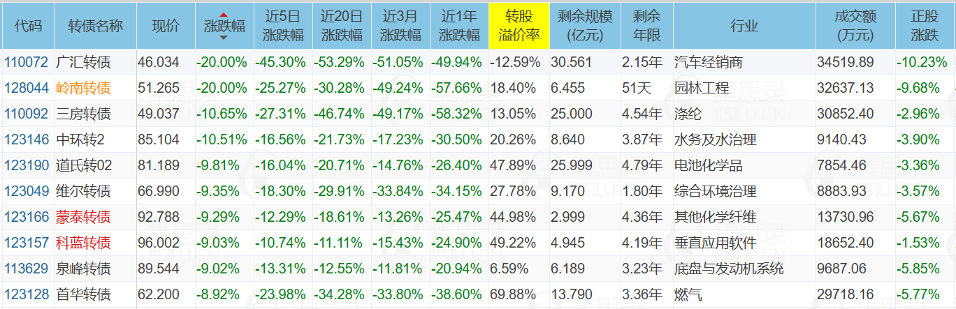 上周已经跌破100元的,今天跌的更狠了,跌幅榜前22只全是100元以下的转债。