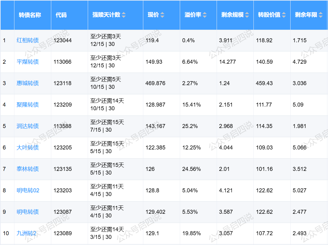 下面这些转债,要注意强赎杀溢价风险,尤其是溢价率在5%以上的。