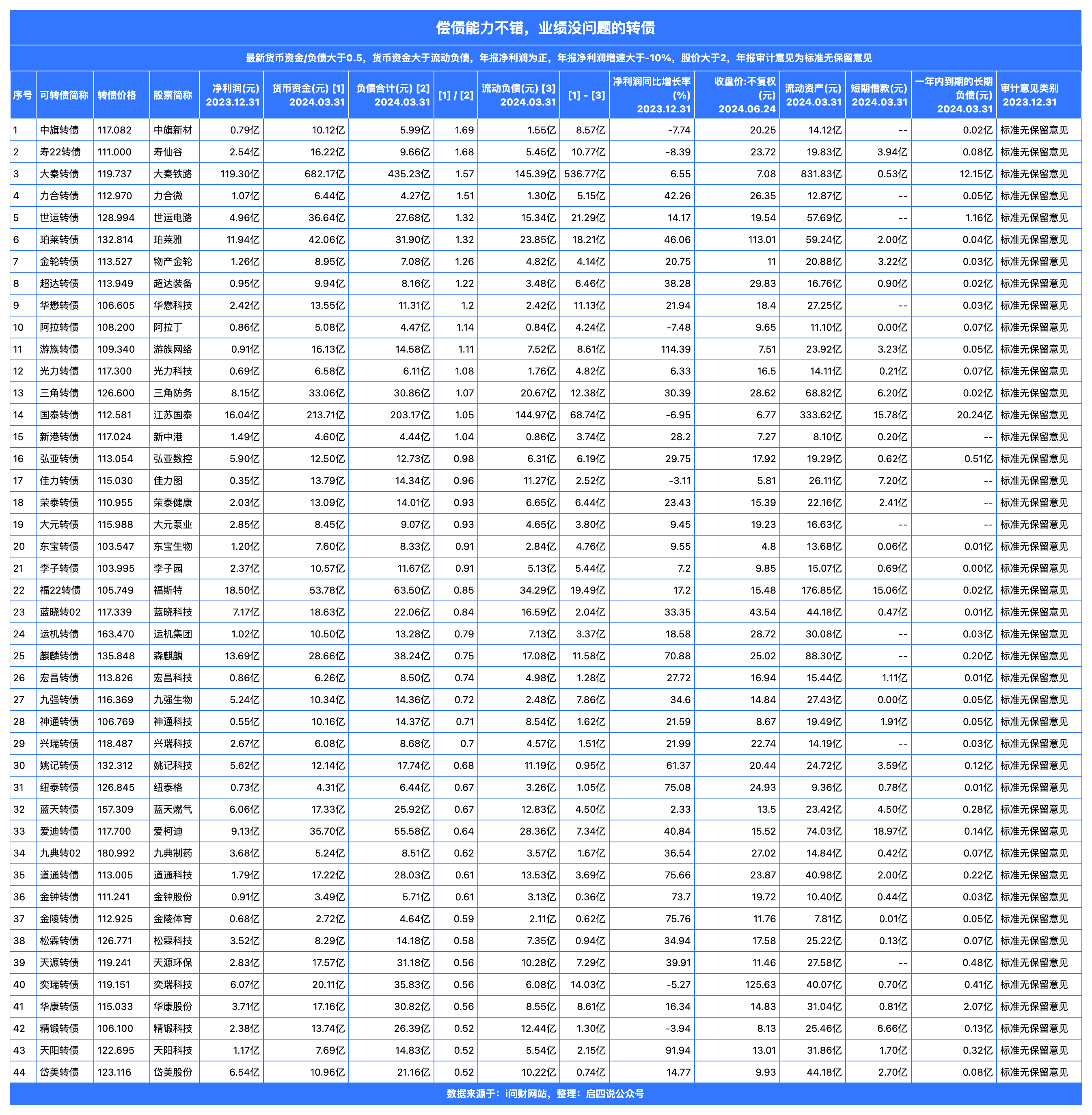 我统计了当前偿债能力不错,业绩也没问题的44只转债。