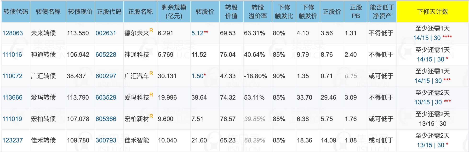 未来2天有6只转债将满足下修条件。其中广汇转债、神通转债、未来转债、宏柏转债下修动机较强。