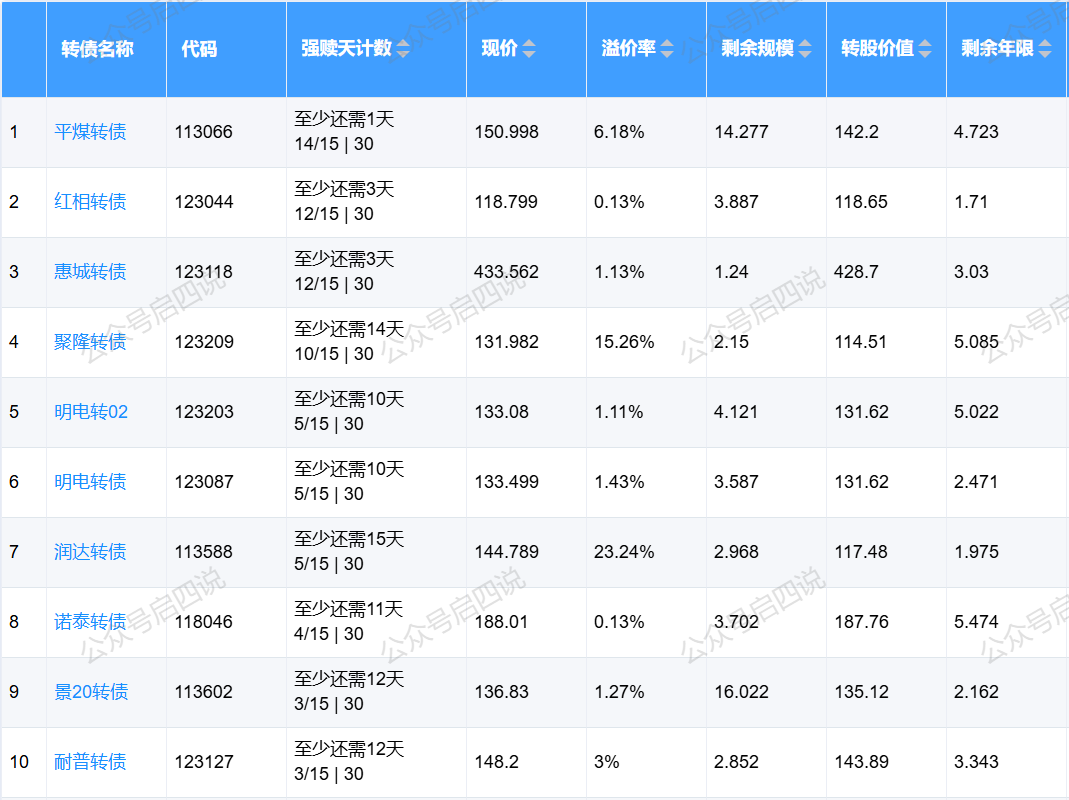 下面这些转债,要注意强赎杀溢价风险,尤其是溢价率在5%以上的。