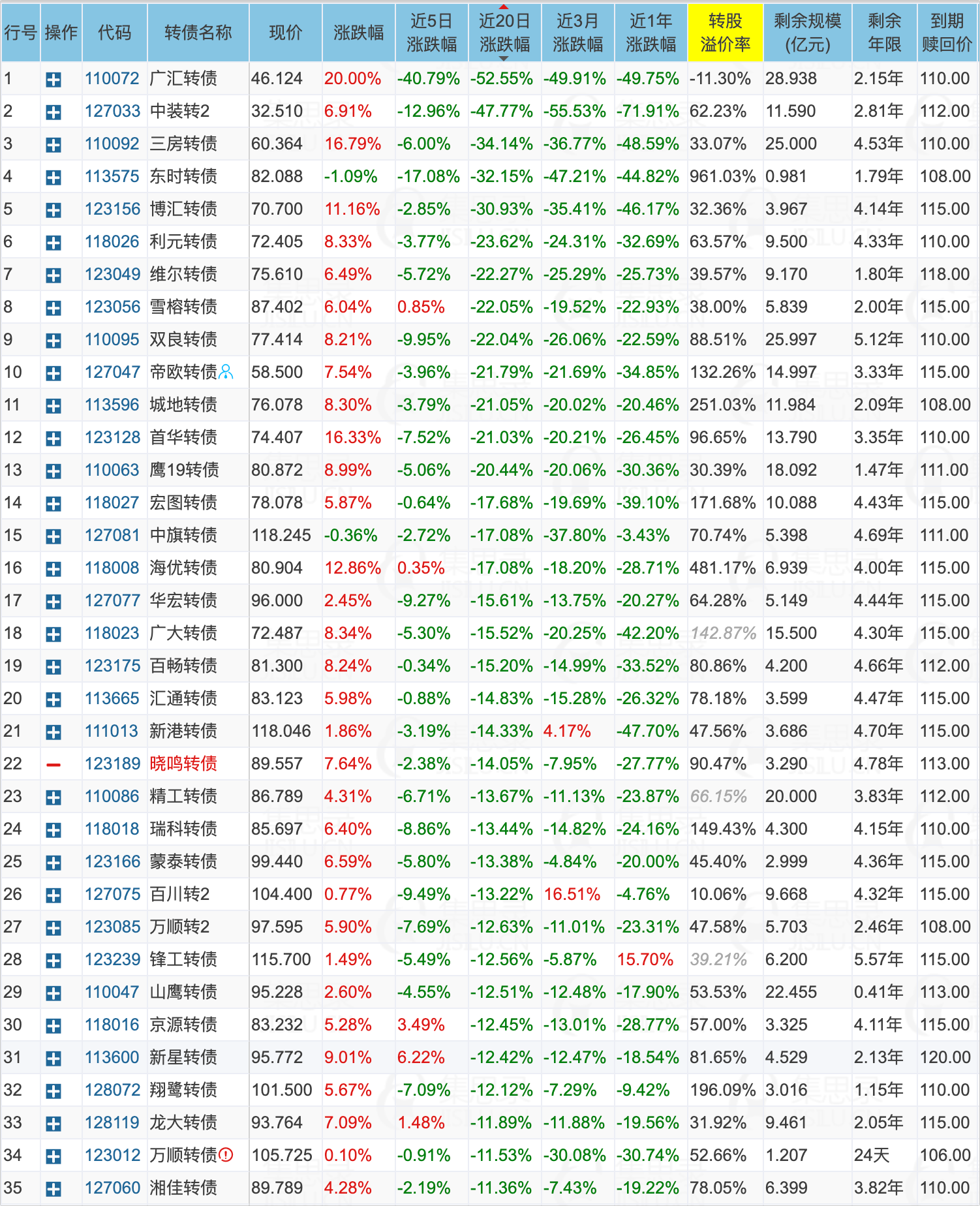 1、优先在近期跌幅较大的转债中寻找补涨机会,下面是120元以下,近20日跌幅最大的35只转债。