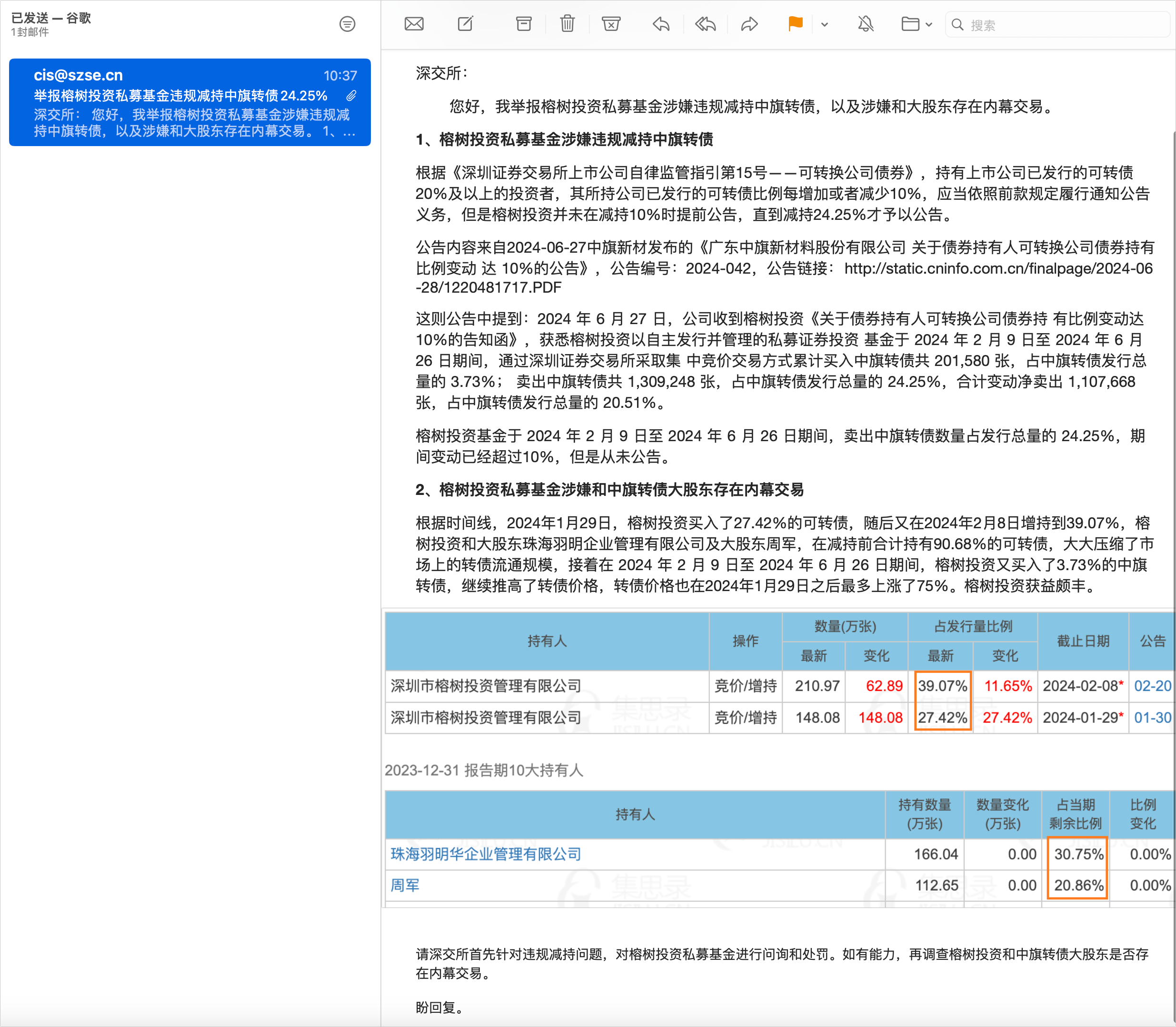 2、今天给深交所发邮件举报了榕树投资私募基金,涉嫌违规减持中旗转债,以及涉嫌和中旗转债大股东存在内幕交易。