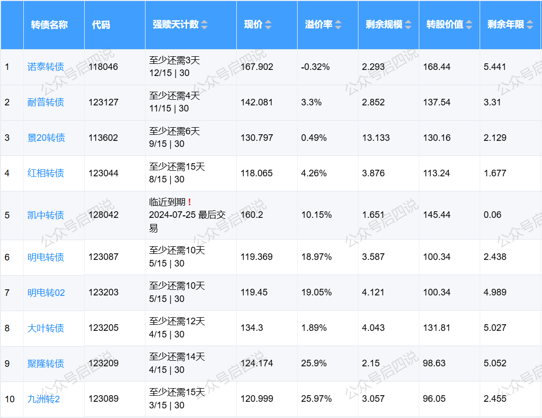 下面这些转债,要注意强赎杀溢价风险,尤其是溢价率在5%以上的。