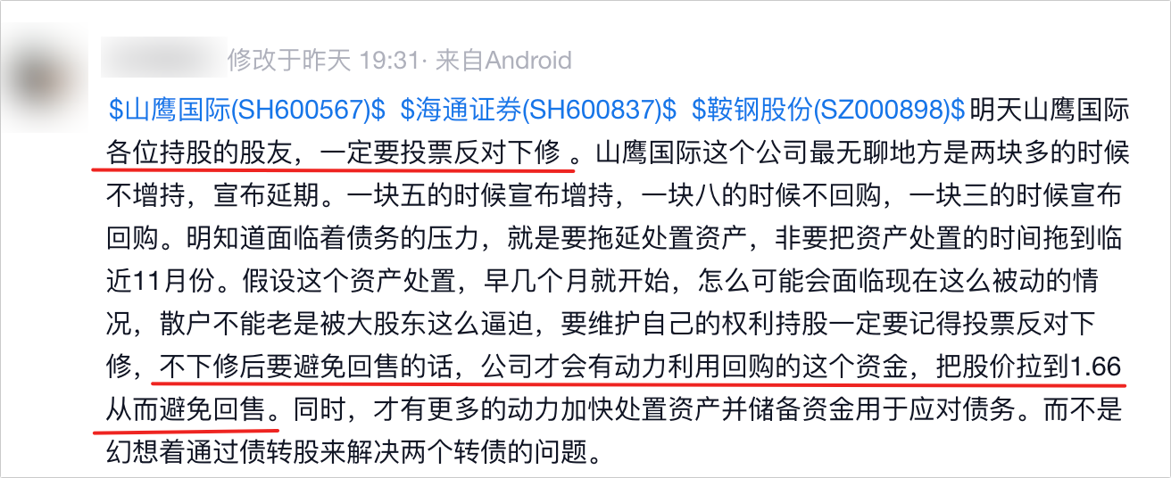 股票持有人的想法完全不同,比如论坛上就有股友在号召投票反对山鹰下修: