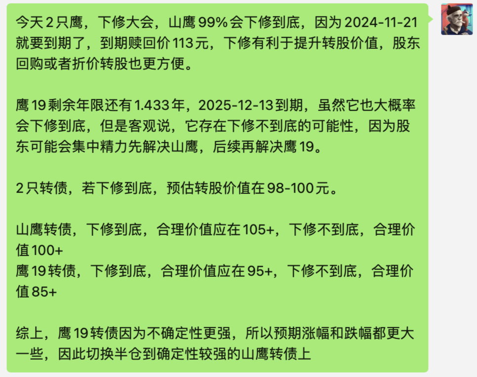 山鹰转债,有足额的资金兑付,公司也基本明牌了会兑付,当前价格102.679元,到期赎回价113元,到期日2024-11-21,到期税后收益20.18%,明天可能不跌反涨。合理价值会逐渐向113靠拢。