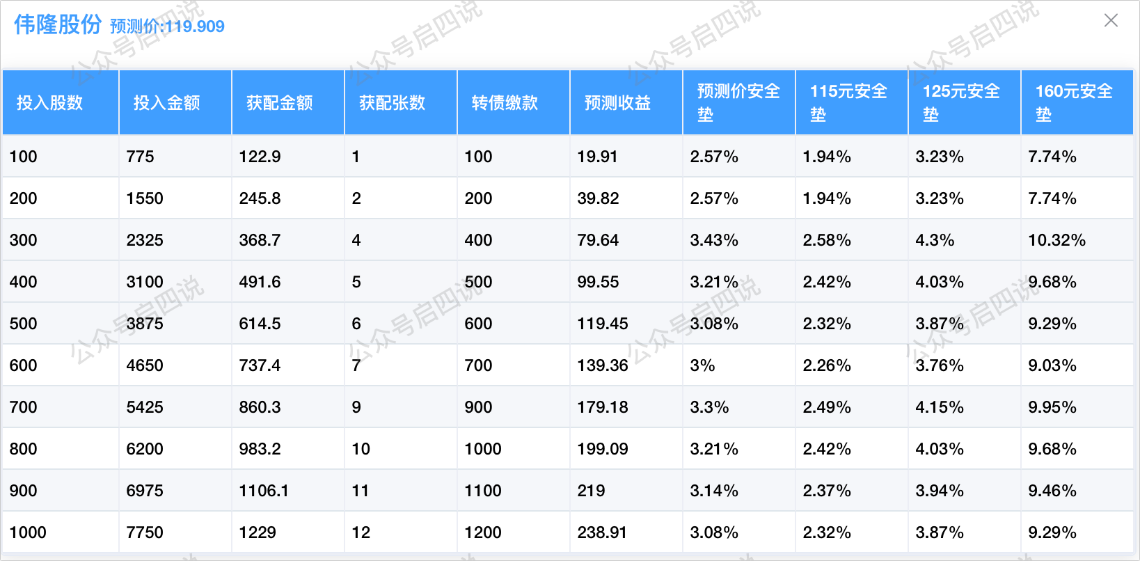 程序预测上市价119.909元,配债所需股数和安全垫可以参考下图: