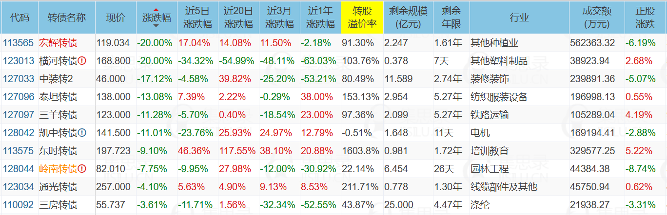 3、跌幅榜的宏辉转债、中装转2、泰坦转债、三羊转债、东时转债今天暴跌,这些都是近2天股债偏离,被游资爆炒的转债,下跌的原因应该来自于这里: