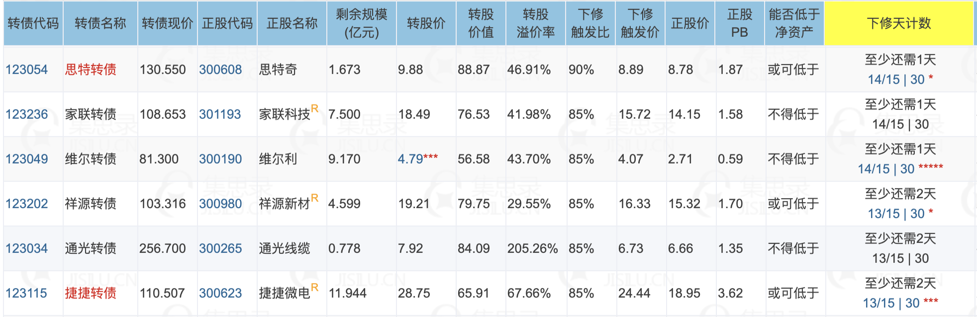 3、明后两天,将有6只转债满足下修条件,个人认为家联转债、维尔转债、捷捷转债的下修动机较强。