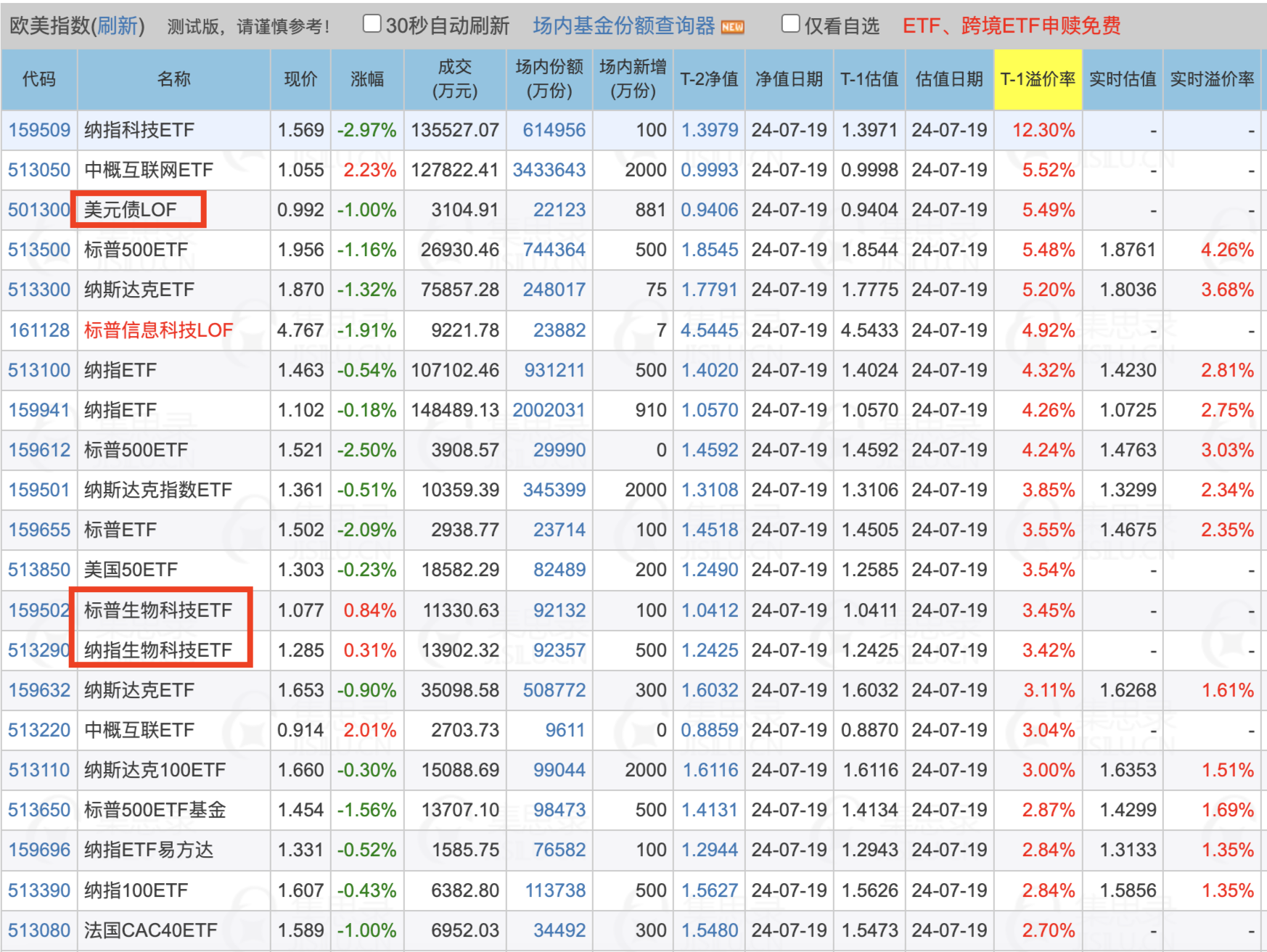 比如降息利好的美元债LOF、标普/纳指生物科技ETF/LOF等,溢价率跌到2%-4%的时候逐步上车比较稳妥。
