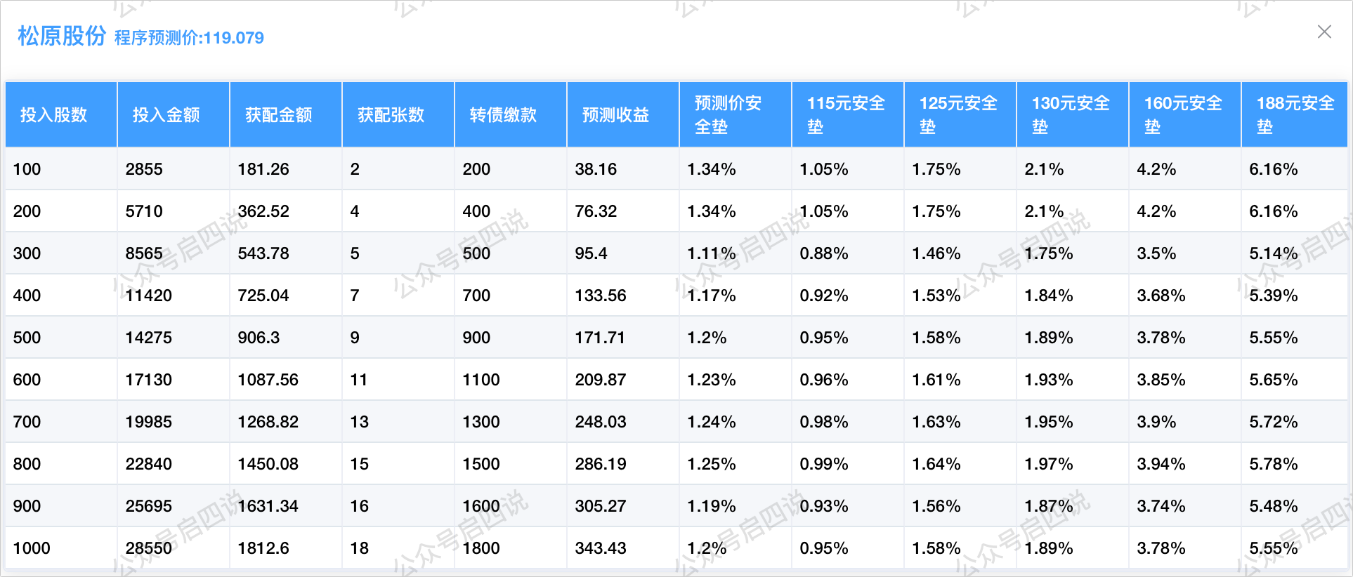 由于流通规模极小,启四预测上市有望冲击200元,配债所需股数和安全垫可以参考下图,安全垫尚可。
