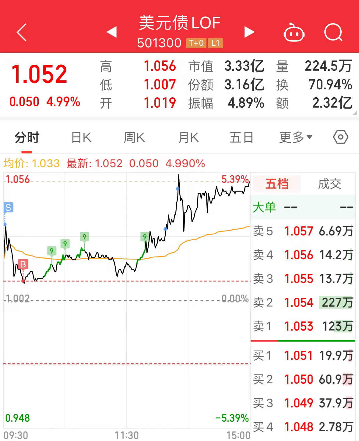 1、美元债lof,1.034卖出1/2,1.01接回,1.034再减1/2,1.049清仓。