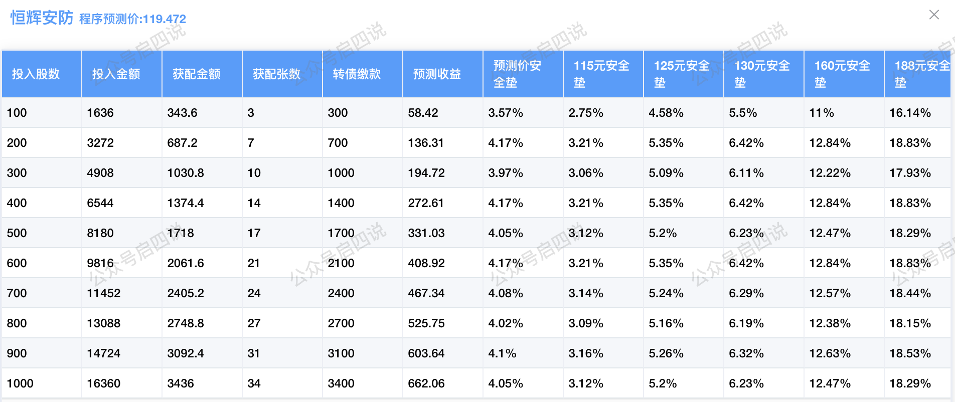 程序预测上市价119.472元,配债所需股数和安全垫可以参考下图: