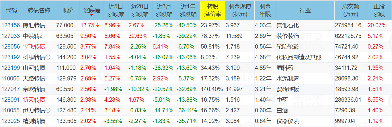 1)维生素 +6.37%,理由:德国化工巨头巴斯夫遭遇大火,维生素等产品交付出现不可抗力。代表债:花园转债。