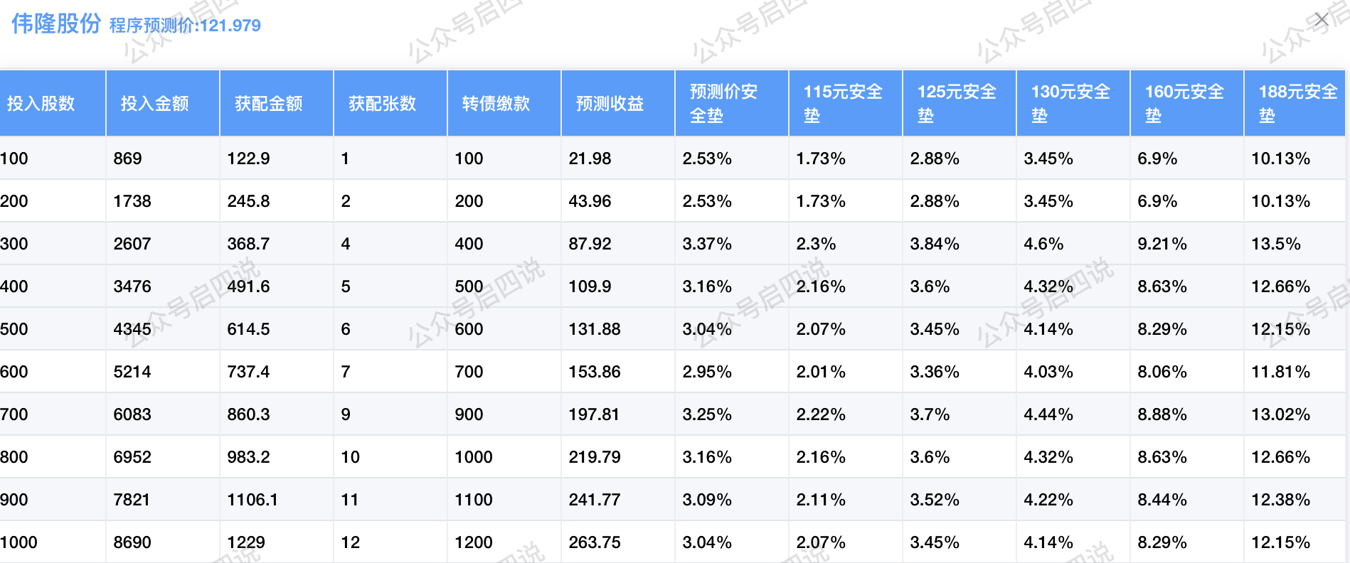 程序预测上市价121.979元,债所需股数和安全垫可以参考下图。