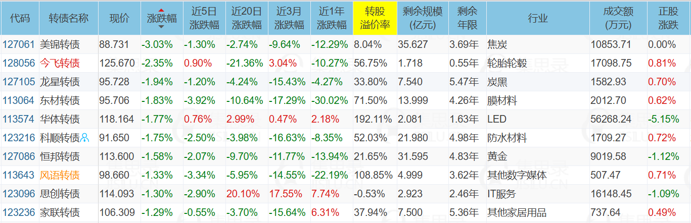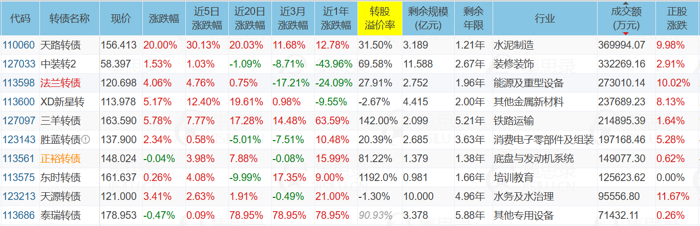 红墙股份(-6.93%)、伟隆股份(-10.00%)、天路转债(20.00%)