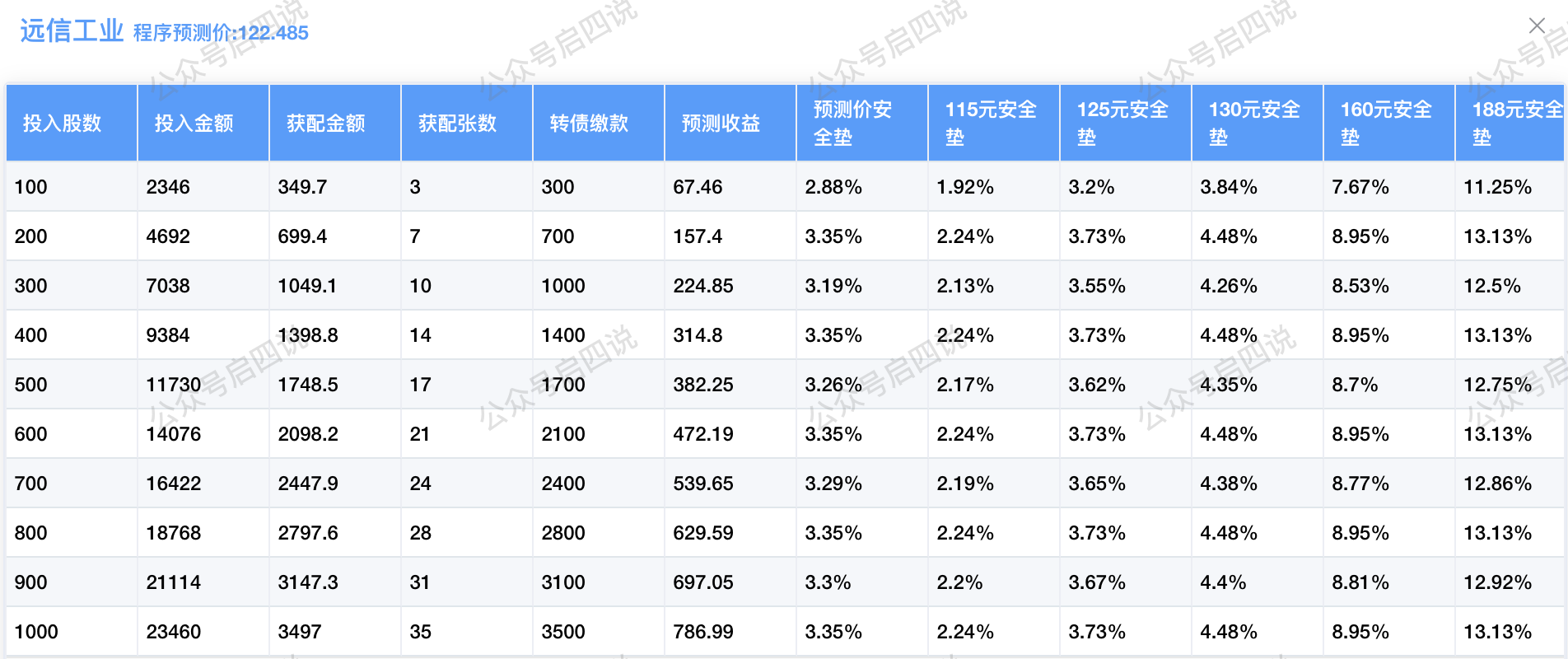 程序预测上市价122.485元,配债所需股数和安全垫可以参考下图: