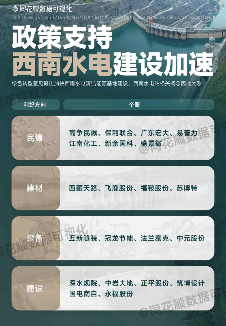 4、今日热点是大基建,理由:全面绿色转型意见:加快西南水电等清洁能源基地建设;加快西北风电光伏、西南水电、海上风电、沿海核电等清洁能源基地建设