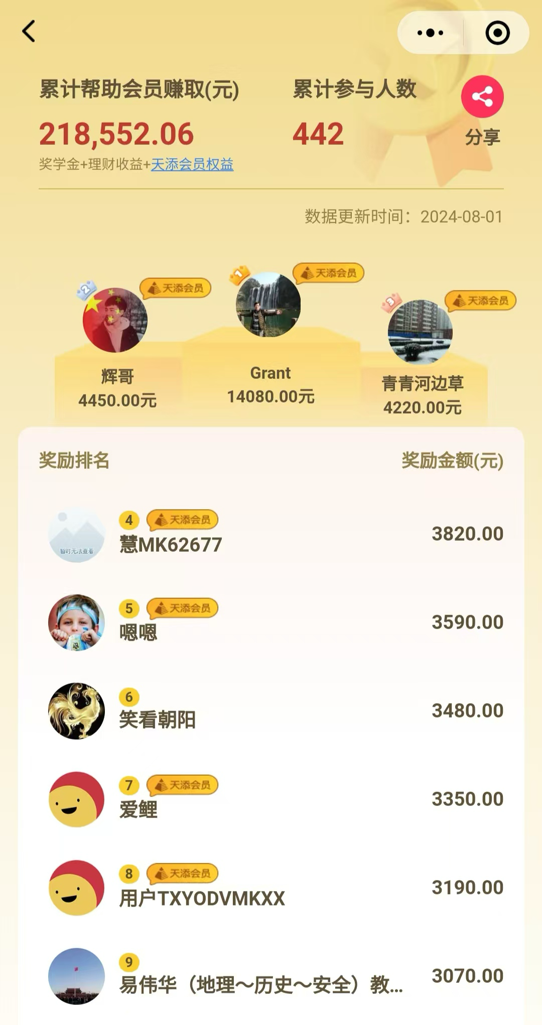 第一名已经薅了14080块钱了,其他粉丝也都是大几千块钱,俱乐部已经累计帮助会员赚取21.8万元了,都是纯现金奖励。