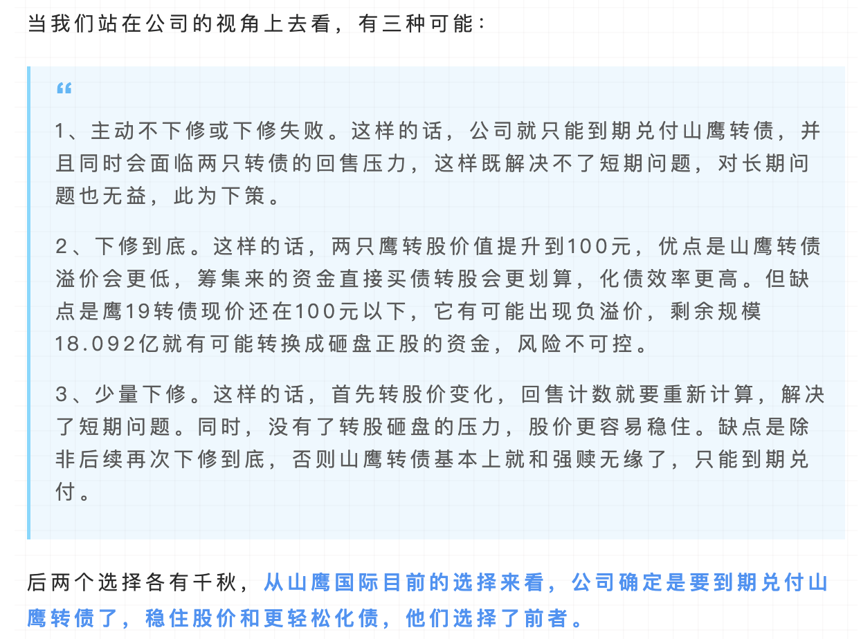 和上次一样未下修到底,这个结果是符合预期的,原因我在之前的文章中说过:山鹰下修不到底,可能是利好
