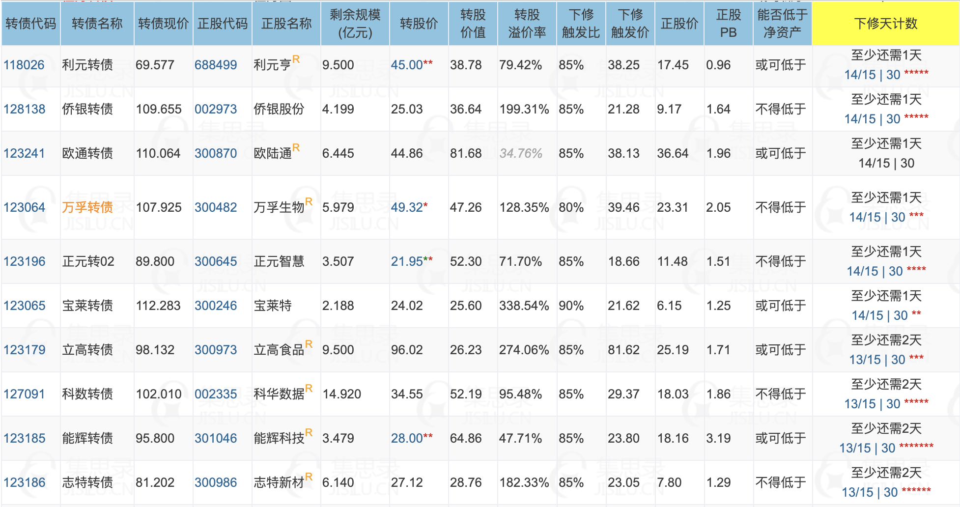3、未来两天将有10只转债最快可满足下修条件,其中欧通转债、万孚转债、宝莱转债、科数转债的下修动机较强。