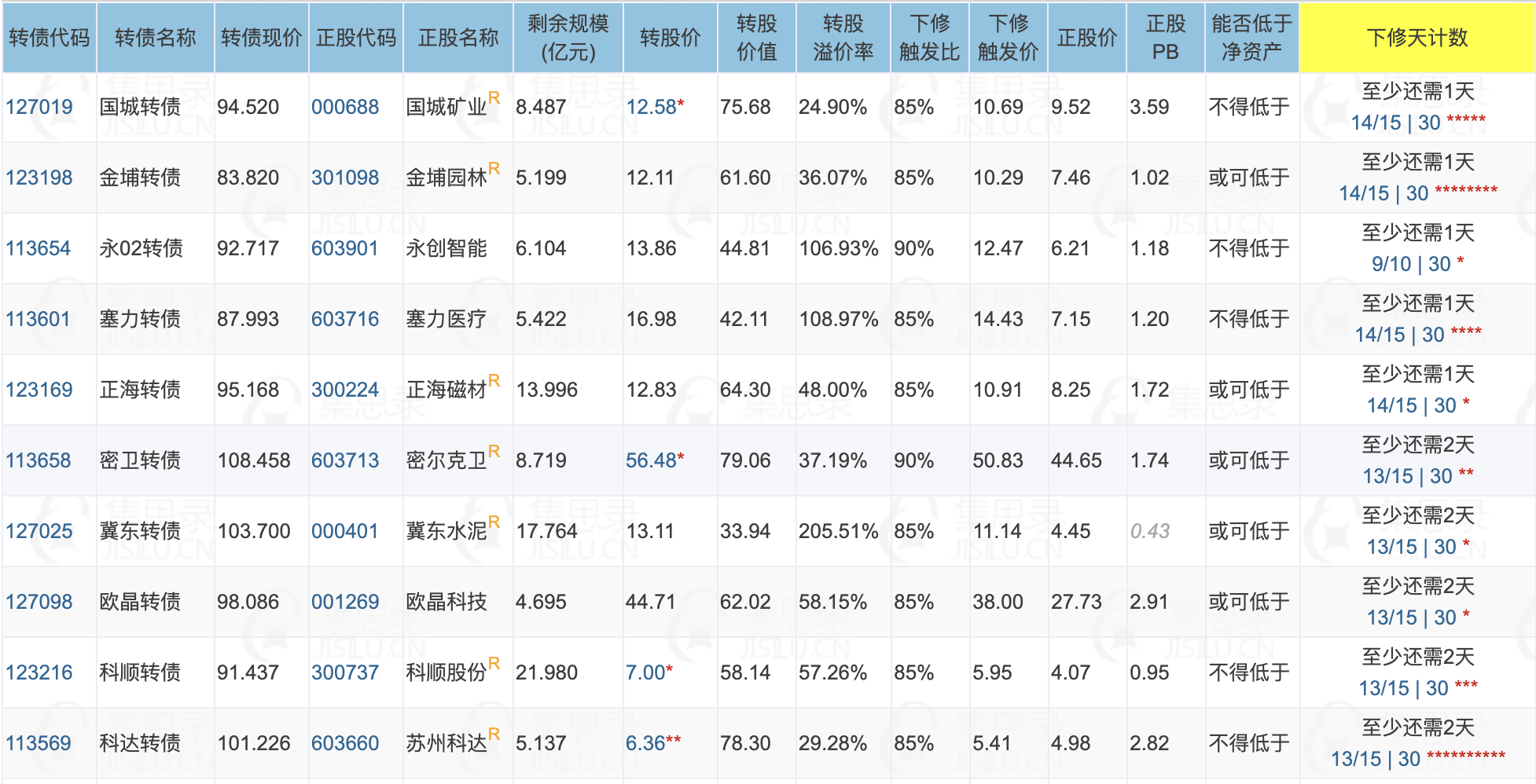 2、未来2天还有10只转债将满足下修条件,其中国城转债、塞力转债、科达转债的下修动机相对较强。
