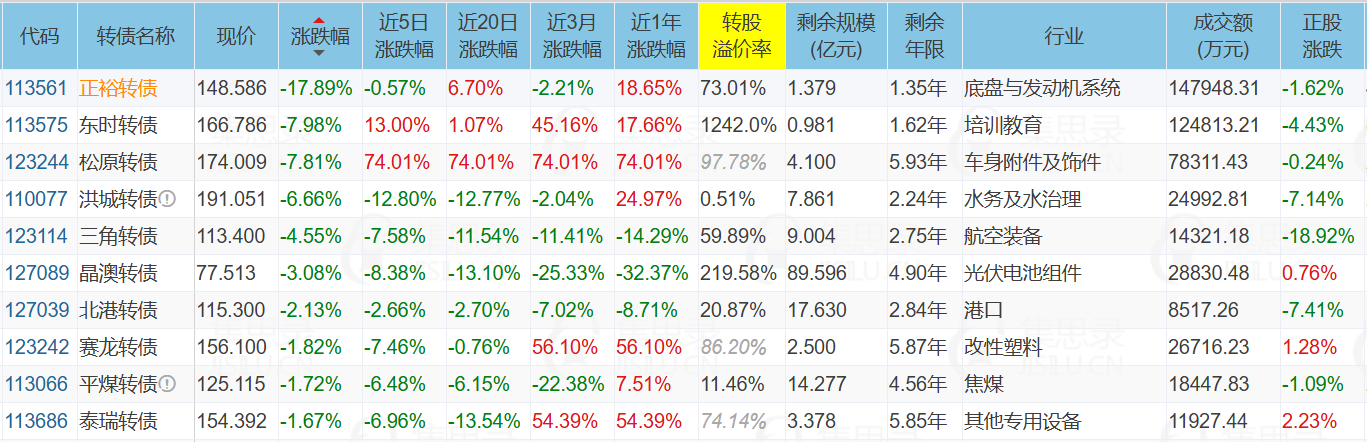 北部湾港(-7.41%)、新疆交建(10.00%)、三角防务(-18.92%)、西藏天路(-2.37%)、正裕转债(-17.89%)